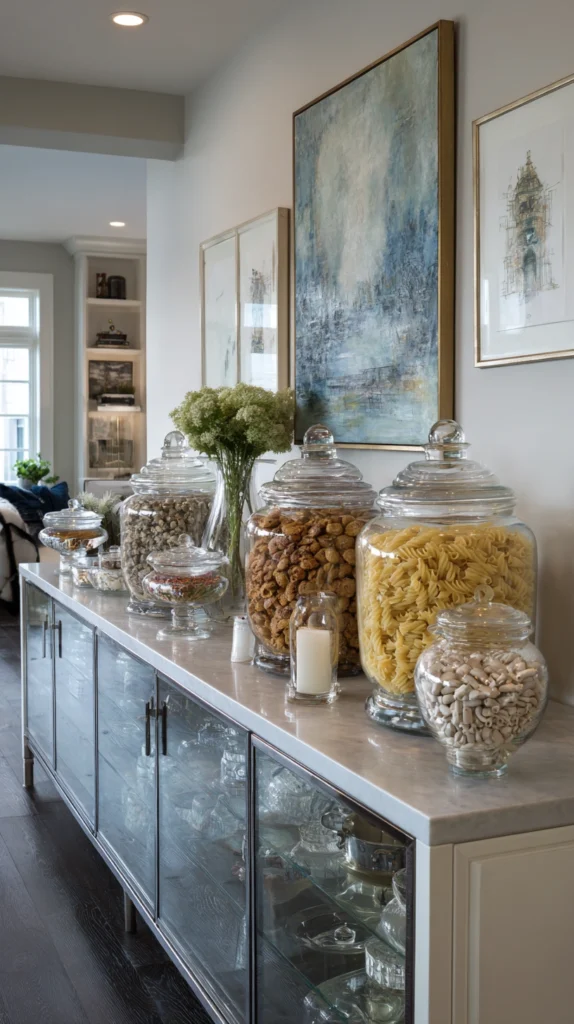 Display dry goods, colorful candies, or seasonal decorations in glass apothecary jars arranged on shelves, sideboards, or a console table. The transparent glass allows contents to become part of the decor—dried pasta in interesting shapes, colorful beans, or seasonal items like pinecones and ornaments create visual interest while remaining accessible.