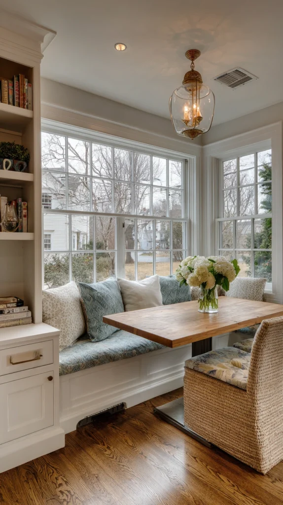 Build or install a window seat with lift-up cushions that conceal storage compartments underneath for table linens, seasonal decor, or serving pieces used occasionally. The seat itself provides additional dining seating during large gatherings while the storage remains invisible beneath beautiful cushions and throw pillows.