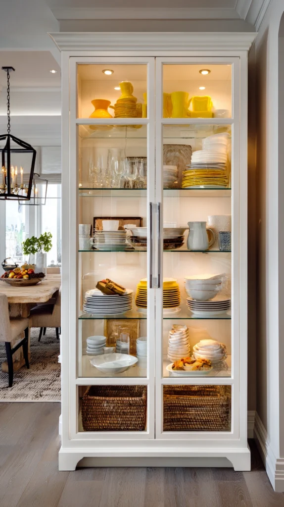 Install or place glass-front cabinets that force you to keep contents beautiful and organized since everything remains visible. This transparency naturally prevents clutter while allowing your dishware collection to function as decor.