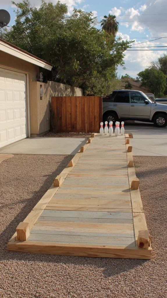 Build the lane surface from smooth exterior plywood panels joined edge to edge on a level timber sub-frame — the smoothness of the surface is critical for consistent ball rolling performance. Edge the lane with low timber side rails that keep errant balls within the lane. Mark the foul line, the approach area, and the pin positions with painted markings and the full bowling experience is complete.