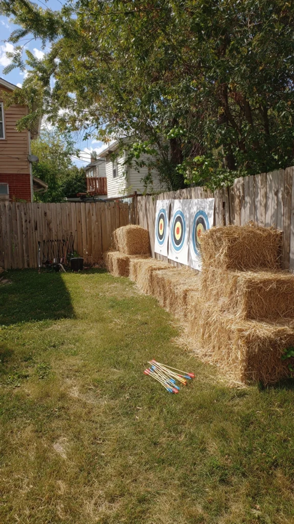 A simple DIY backyard archery range — a safe backstop of stacked straw bales, a target face attached to the front bale, and a clearly marked shooting line at an appropriate distance — creates one of the most genuinely skilful and most individually satisfying of all backyard game installations.