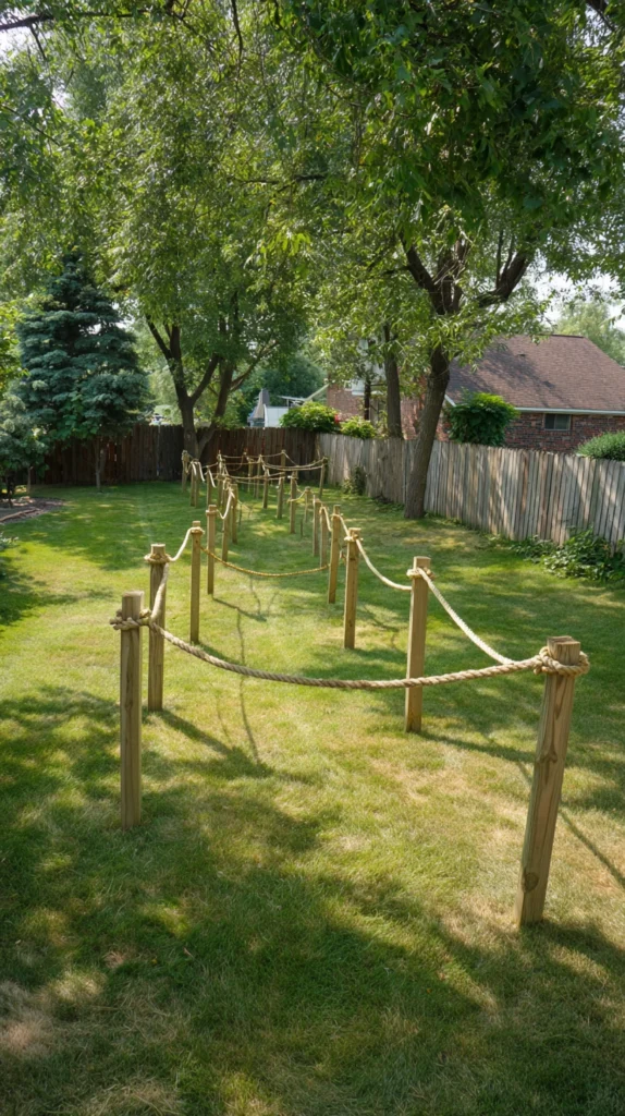 A rope maze — a series of ropes stretched between timber stakes at varying heights throughout a defined garden area, creating a three-dimensional obstacle course that players must navigate without touching the ropes — creates a DIY backyard game of genuine physical challenge and irresistible competitive appeal.