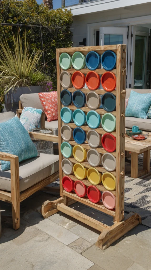 A giant Connect Four game — a large standing timber grid of seven columns and six rows into which oversized discs are dropped from the top — creates a backyard strategy game of genuine intellectual engagement and satisfying physical scale. The oversized format transforms a familiar tabletop game into a garden installation of considerable visual impact and genuine playability for all ages.
