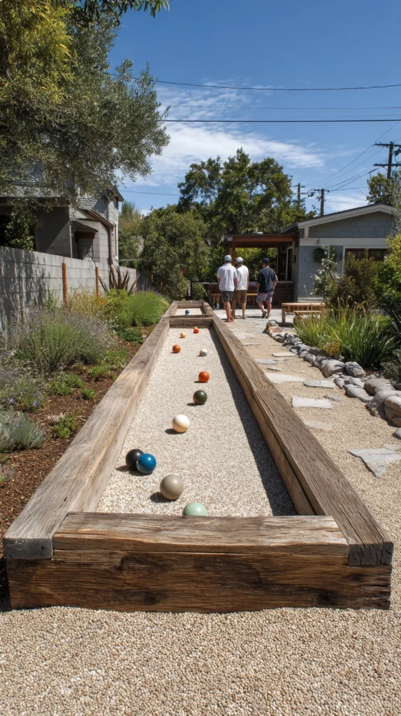 A permanent bocce ball court — a flat, compacted surface of decomposed granite or fine gravel contained within a timber border, approximately 4 metres by 12 metres — creates a backyard game installation of considerable social usefulness and genuine long-term value.
