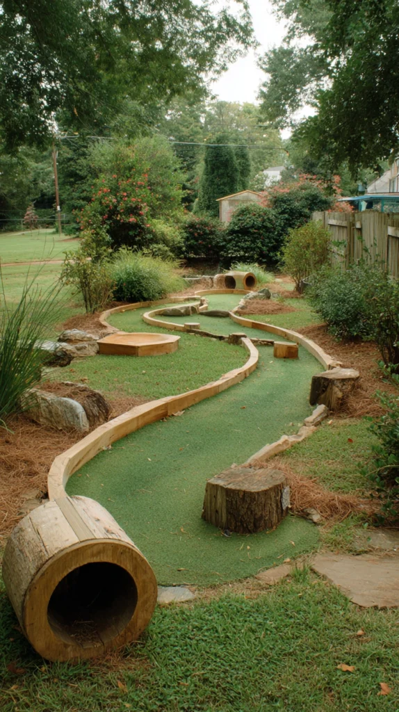 Design each hole with a distinct character — a straight simple hole for beginners, a curved hole with a timber side border, a hole with a tunnel made from PVC pipe, a hole with a windmill obstacle, a hole with a bridge over a shallow water feature. Build each hole from exterior timber, PVC fittings, and creative salvaged materials. Set each hole in a defined area of the garden connected to the next by a paved or timber path that creates the genuine course-walking experience of real mini golf.