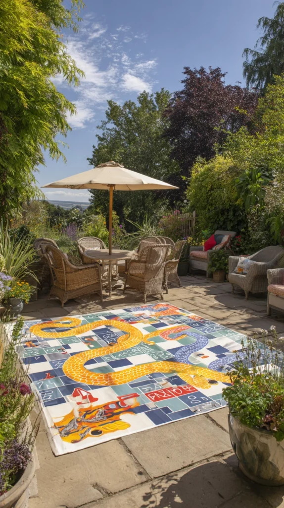 A giant snakes and ladders game painted directly onto a garden lawn, patio, or a large canvas groundsheet creates a garden game installation of spectacular visual impact and enormous family appeal.
