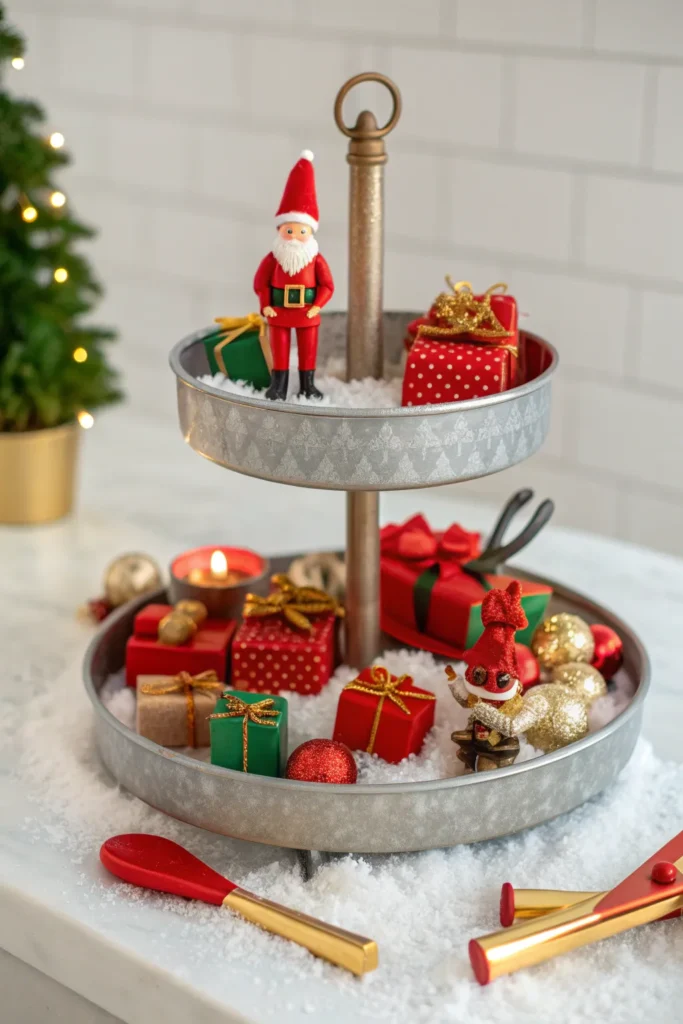 Bring some fun to your decor with a mischievous elf-themed tray. Add mini elf figurines, colorful ornaments, and playful signs like “Elf Surveillance.”