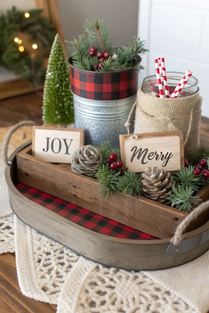 Create a warm farmhouse look with wooden accents, buffalo plaid, and touches of greenery. Use small wooden signs with words like “Joy” or “Merry,” paired with mini galvanized buckets holding faux pine sprigs.