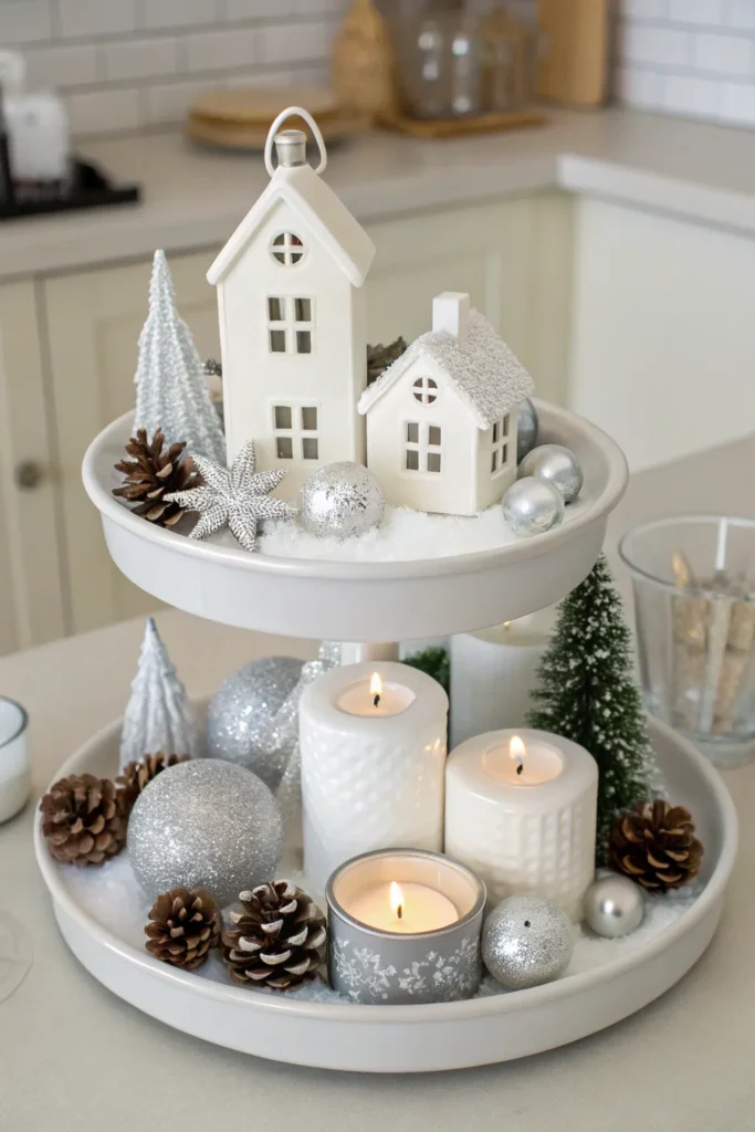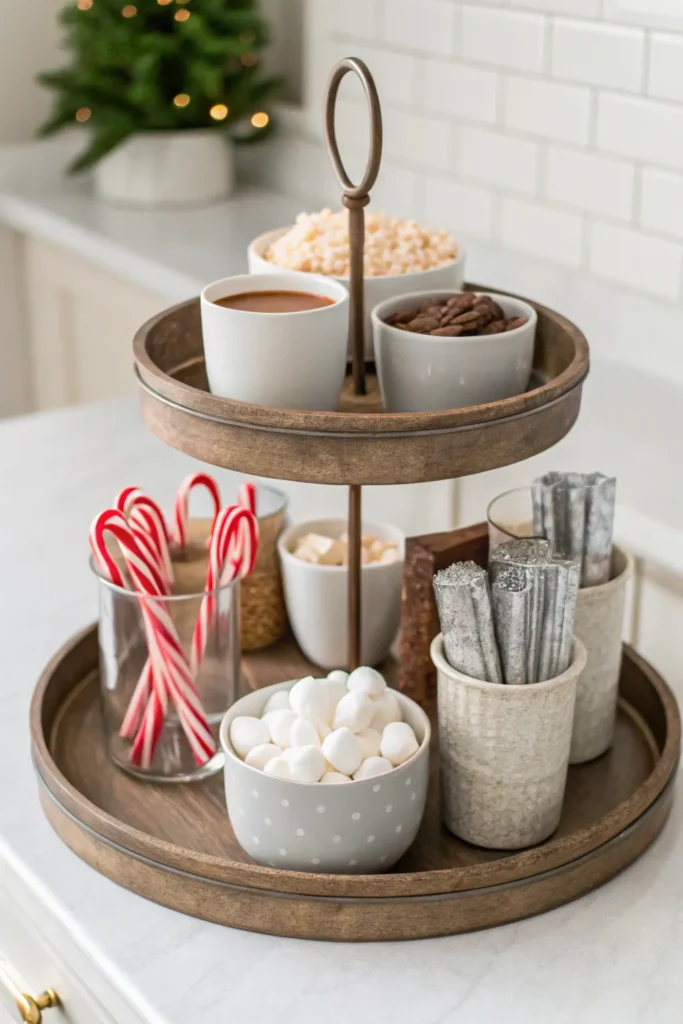 Turn your tiered tray into a mini hot chocolate station. Add mugs, marshmallows, cocoa packets, and candy canes in small containers. A tiny chalkboard sign saying “Hot Cocoa Served Here” completes the setup.