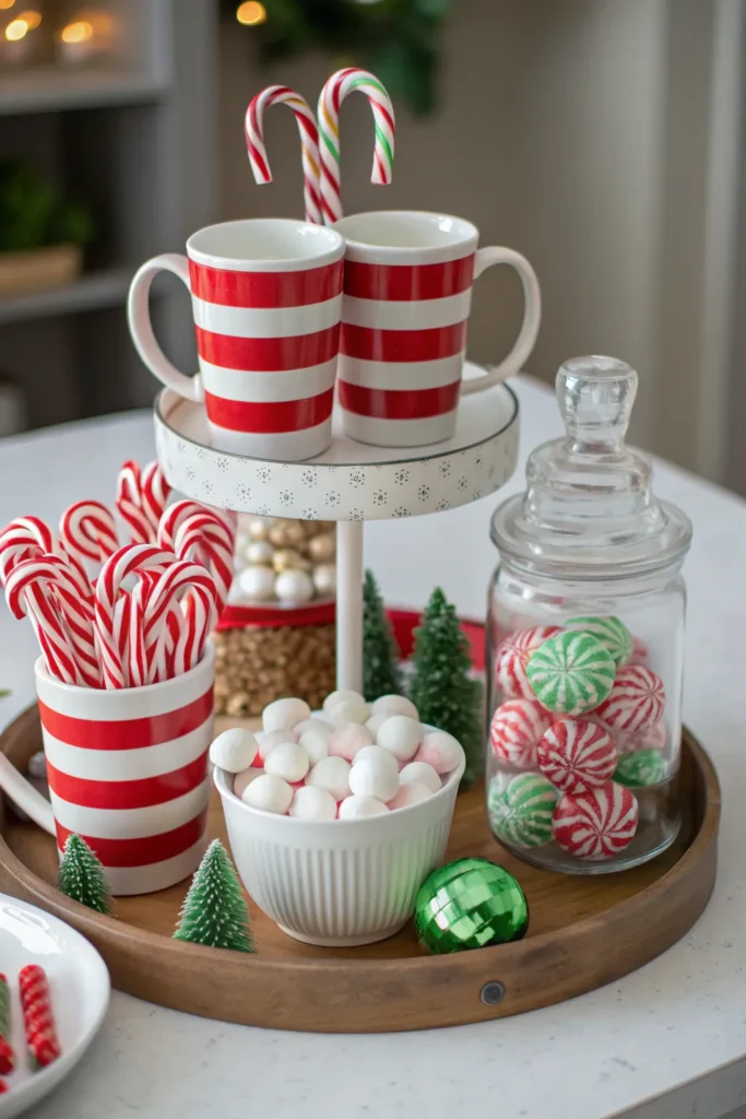 If you love peppermint everything, dedicate your tray to candy canes! Mix striped red-and-white mugs, peppermint candies, and candy cane ornaments. A little jar filled with mini marshmallows ties it all together.