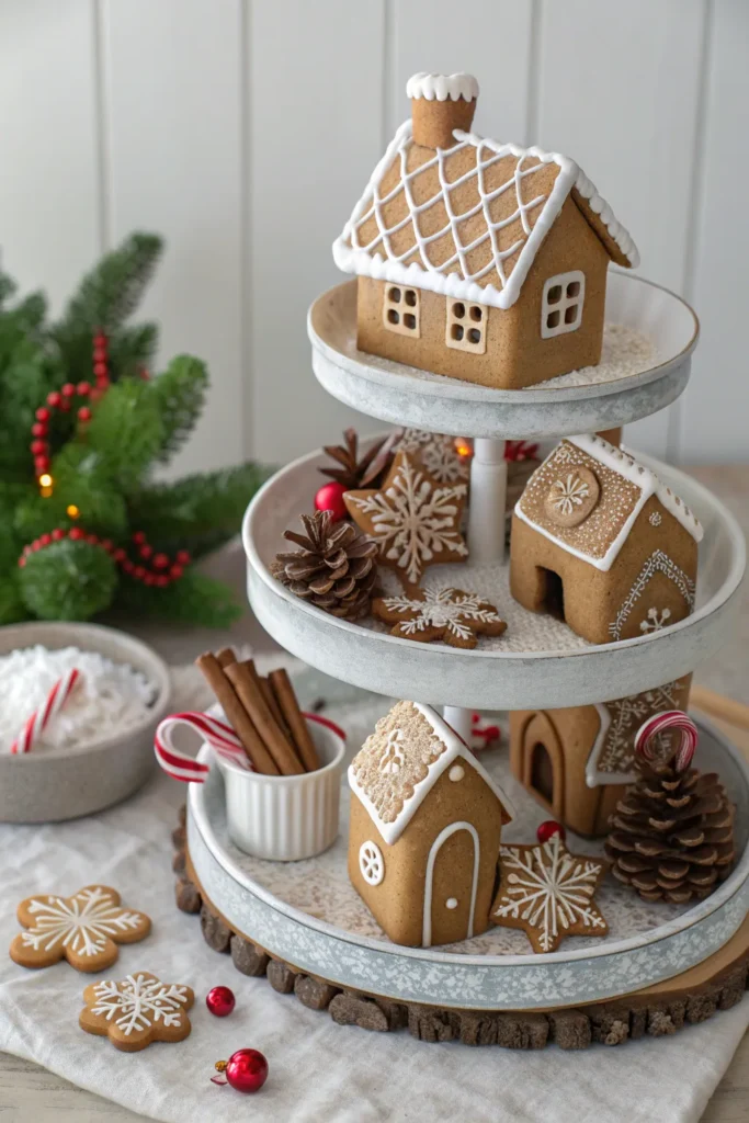 Celebrate the sweetness of the season with a gingerbread-themed tray. Add small gingerbread houses, cookie ornaments, and cinnamon sticks. A mini rolling pin or whisk gives it a cute kitchen flair.