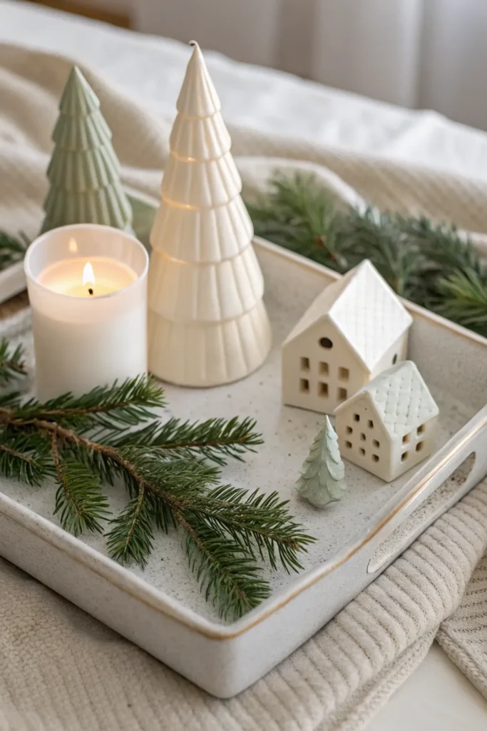 For a modern and calming display, go neutral. Use beige, white, and soft green tones with simple ceramic trees or mini houses. A small candle adds warmth and glow.