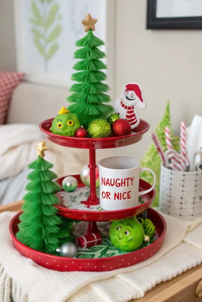 Go playful with a fun green-and-red Grinch theme. Add a few cartoonish ornaments, bright green bottlebrush trees, and a mini “Naughty or Nice” sign.