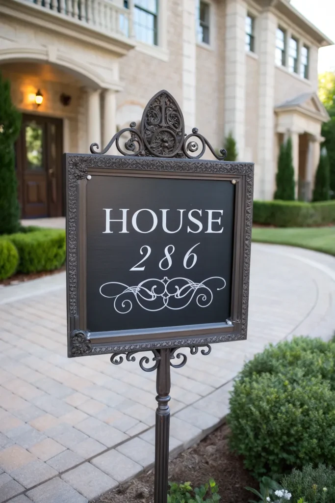 A chalkboard-inspired sign allows you to combine practicality with creativity. Paint a wooden board with chalkboard paint, attach your numbers, and leave space for a message section.