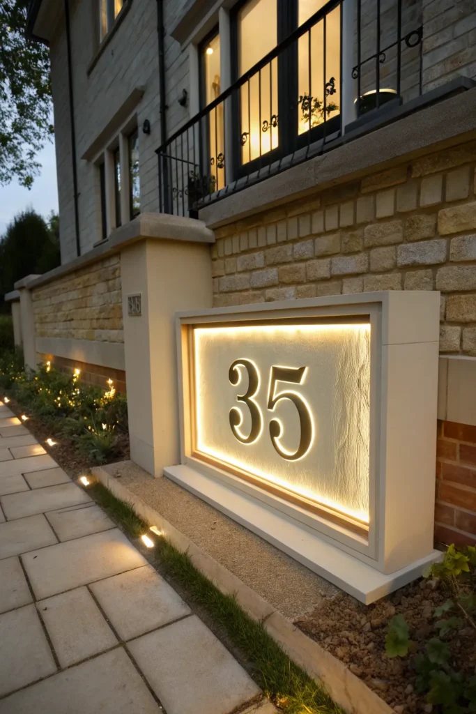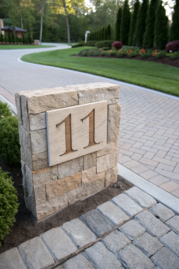 This idea suits classic, traditional, and upscale homes. Stone is highly durable and withstands all weather conditions. When paired with warm lighting or placed near greenery, a stone sign creates a refined focal point at your entrance.