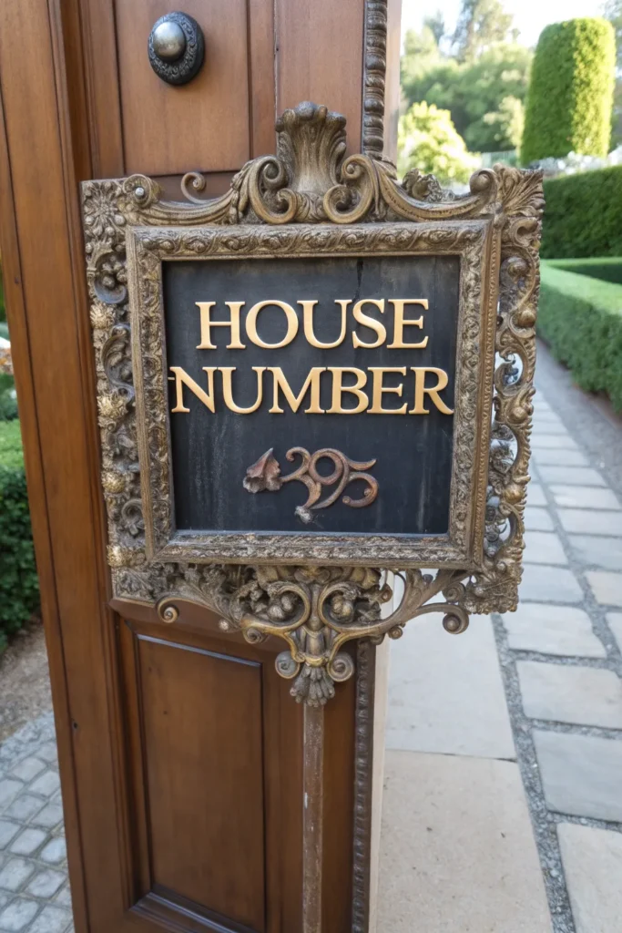 For a unique and eclectic look, place your house numbers within an ornate vintage frame. Choose a frame with intricate carvings, gold accents, or distressed details. Mount the frame onto wood backing or hang the numbers inside directly.