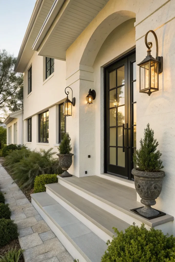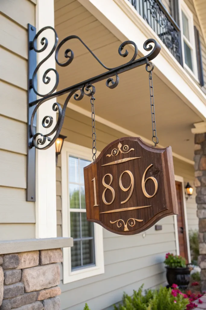 A hanging sign adds movement and charm to your exterior. Use a wooden or metal plaque suspended from a decorative bracket or wrought iron arm. The sign can be double-sided, allowing visibility from both directions.