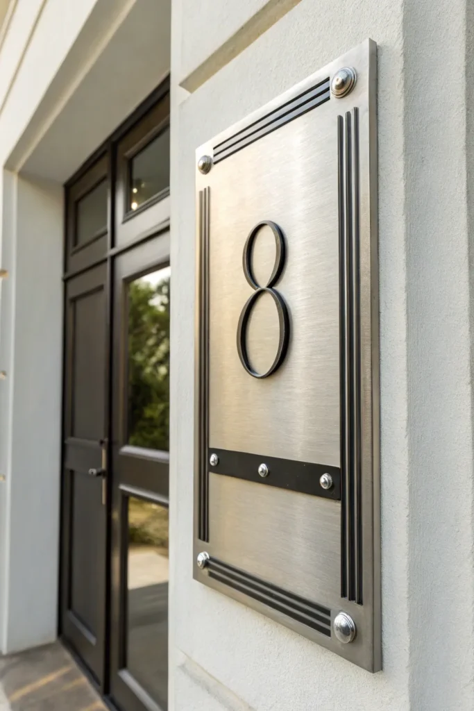 If your style leans industrial or modern urban, a metal plate sign is both durable and stylish. Use a galvanized steel sheet, aluminum panel, or corrugated metal piece as your base. Pair it with matte-black or brushed-silver metal numbers.