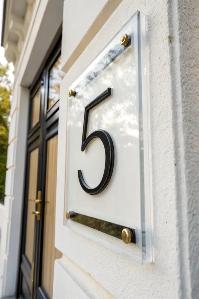 Acrylic signs offer a clean, modern look that’s perfect for minimalist homes. Use a frosted, clear, or smoked acrylic sheet and attach raised numbers in a modern font. Acrylic looks sophisticated and can be mounted using metal standoffs for a floating effect.