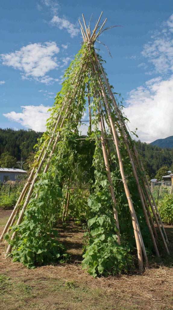 A bamboo teepee — five or six bamboo canes pushed into the soil in a circle and tied together at the top with natural twine — is the most versatile and widely useful DIY plant support available. It suits climbing beans, sweet peas, cucumbers, and any other climbing or scrambling plant that needs a framework to ascend.