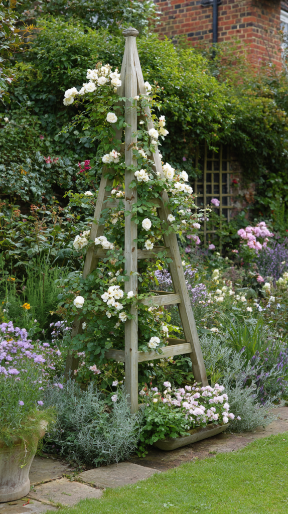 A redundant timber or metal ladder laid flat on the soil or leaned against a wall creates a ready-made plant support of considerable charm and genuine practical effectiveness. Horizontal rungs spaced at regular intervals provide natural support points for climbing and scrambling plants, and the slightly industrial quality of a repurposed ladder adds an unexpected and interesting visual element to garden planting.