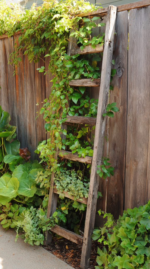 Lay a short stepladder flat on the soil surface over a bed of sprawling plants — the rungs support individual stems at the correct height with no tying required. Lean a longer ladder against a wall or fence and train climbing plants up the rungs as a vertical support. Paint the ladder in a complementary color for a more intentional, designed appearance.