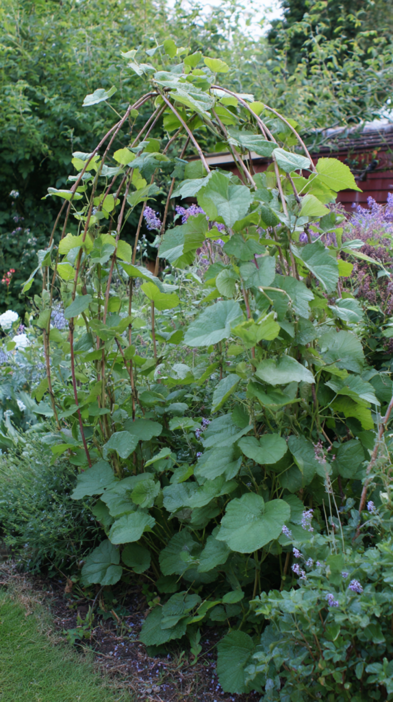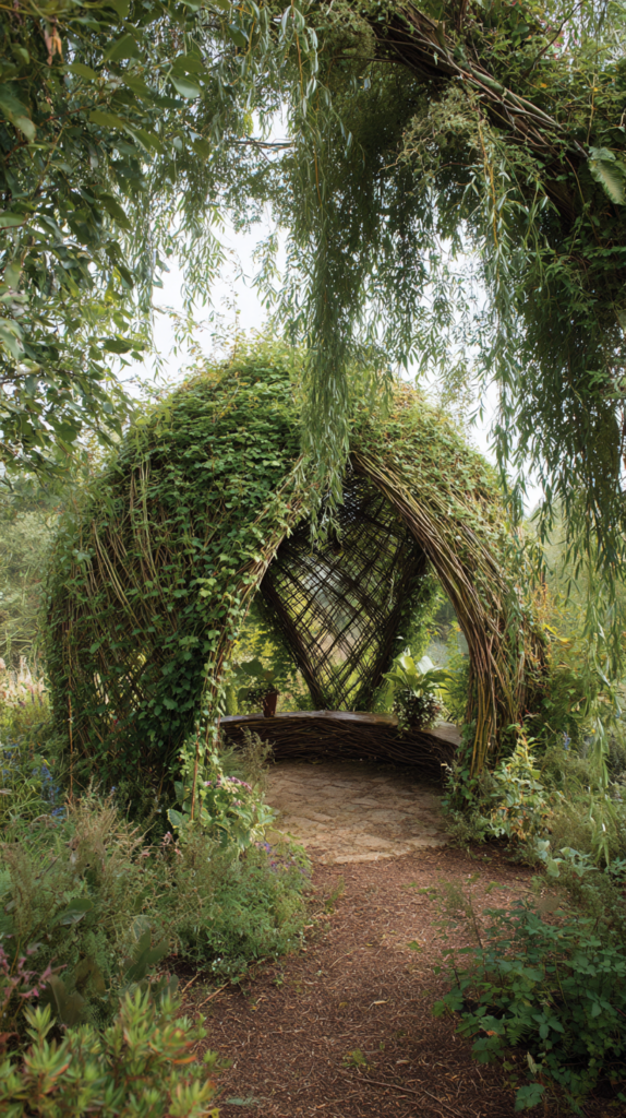 A woven willow dome — living willow rods pushed into the soil in a circle and woven together as they grow, creating a living green structure — is the most magical and organically beautiful of all DIY plant supports. The willow roots from the pushed-in rods, leafs out in spring, and creates a genuinely living garden feature that improves every season as the weave thickens and fills.