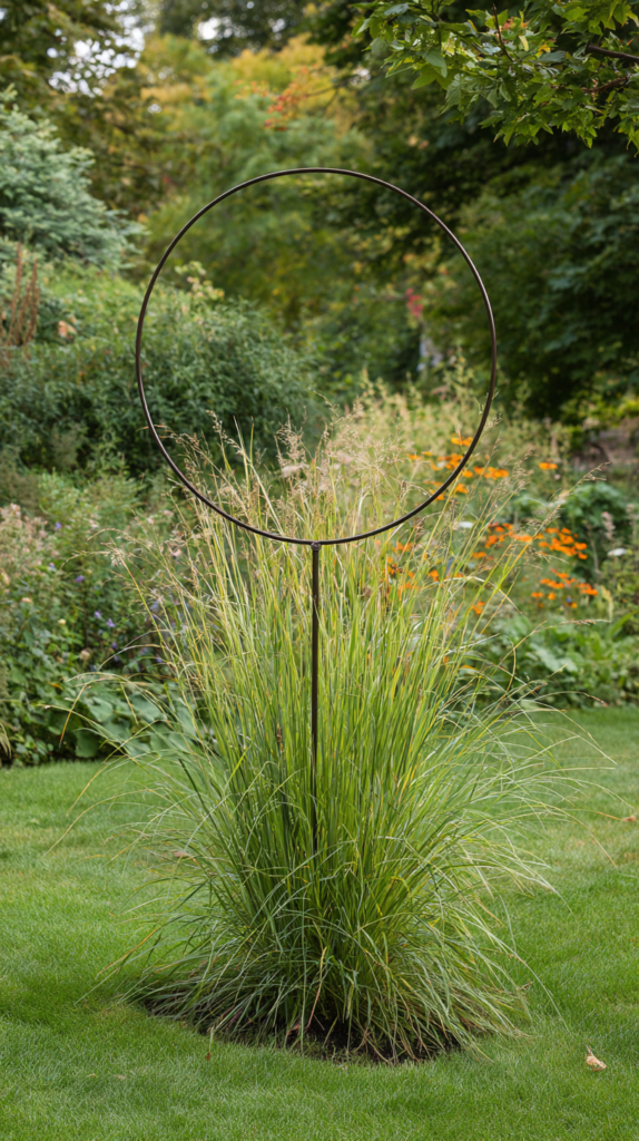 A grow-through ring — a circle of heavy wire or a purpose-bent metal hoop mounted on a single central stake — provides targeted support for individual floppy perennial plants without the visual bulk of a full cage or the complexity of a multi-stake string grid. The ring is positioned above the plant crown in early spring and the plant grows up through the circle naturally, supported around its perimeter.