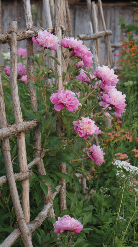 A grid of natural twine stretched between a series of wooden stakes driven into the soil creates a horizontal support network for floppy perennials — peonies, dahlias, delphiniums, and herbaceous plants that need support from below as they grow through the grid rather than from above with individual ties.