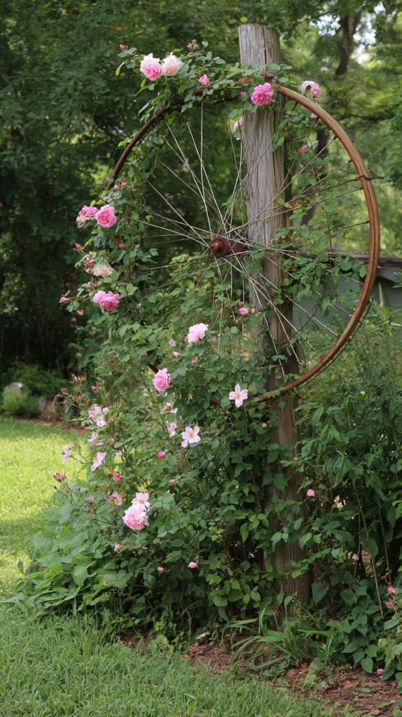 An old bicycle wheel fixed to a wall, fence, or post creates a circular trellis of genuine originality — the radiating spokes provide multiple climbing lines for plants and the circular form creates a beautiful focal point in the garden even before any plant has climbed it. Clematis, climbing roses, and annual climbers all use bicycle wheel trellises enthusiastically.