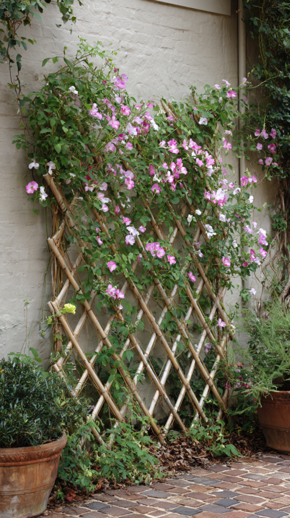 A flat fan trellis made from bamboo canes tied together with natural twine — the canes arranged in a spreading fan shape and tied at each intersection point — creates a wall-mounted climbing support of natural beauty that suits cottage gardens and informal planting schemes beautifully. The hand-tied quality of a bamboo fan trellis gives it a considered, artisan character that manufactured trellis panels lack.