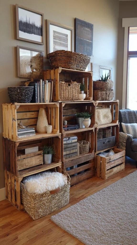 Wooden fruit crates or simple timber box crates stacked and fixed together make one of the most charming, affordable, and practical shelving units you can build without advanced woodworking skills. They work beautifully in a bedroom, living room, home office, or children’s room.