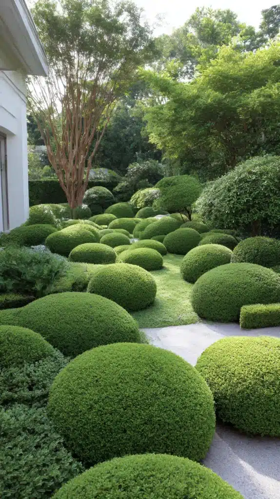 A garden incorporating cloud-pruned topiary — evergreen shrubs of yew, box, or Ilex crenata trained and pruned into organic, rounded, cloud-like forms — creates a garden of extraordinary sculptural beauty and genuine botanical artistry.