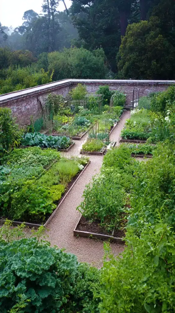 A walled kitchen garden — a formal or informal garden enclosed by brick, stone, or rendered walls and planted with an abundant combination of vegetables, fruits, herbs, and cutting flowers — creates the most romantically beautiful and the most genuinely productive garden space available.