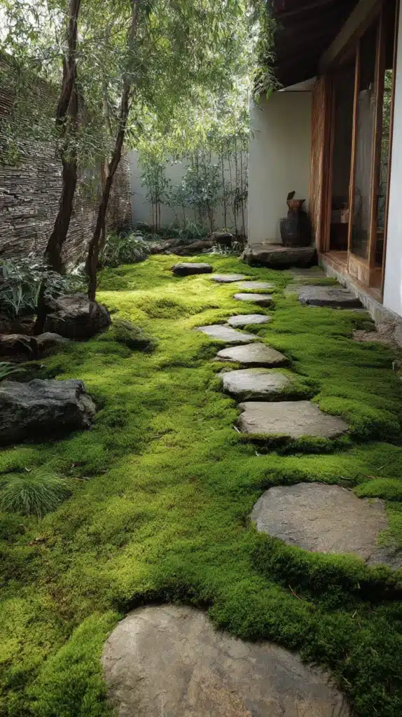 A Japanese moss garden — a continuous carpet of living moss across a shaded garden floor, with carefully positioned stone stepping stones, a single specimen tree, and the complete quiet of a space designed for contemplation rather than activity — creates a garden of extraordinary meditative calm and genuine natural beauty.