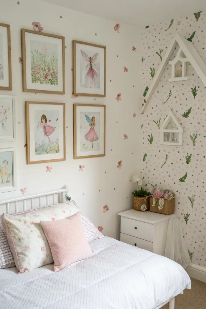 Create a small gallery wall with fairy illustrations, woodland scenes, and gentle inspirational quotes. Use simple frames in white or pastel shades to keep the look cohesive.