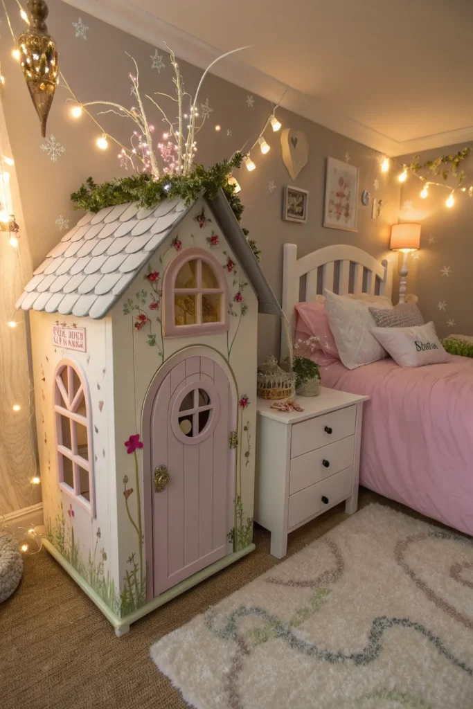 A fairy-house-style bedside table adds charm and function at the same time. These can look like little cottages, tree stumps, or mushroom houses with tiny windows and doors.