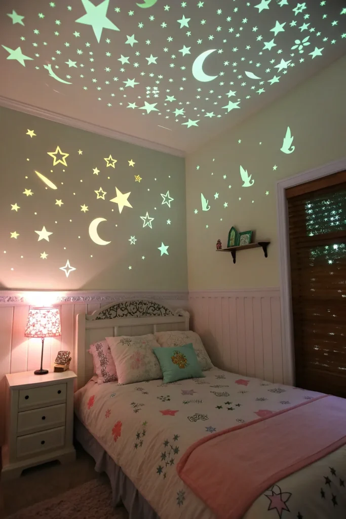Glow-in-the-dark decals on the ceiling or walls add a magical nighttime surprise. Stars, moons, and tiny fairies softly glowing after the lights go out can make bedtime exciting instead of scary.