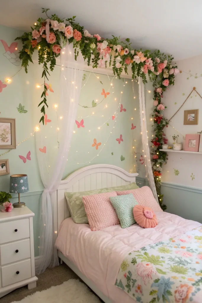 A flower garland draped over the headboard or along the wall above the bed instantly gives the room a fairy-garden feel. You can use faux flowers, greenery, or even fabric garlands in soft colors.