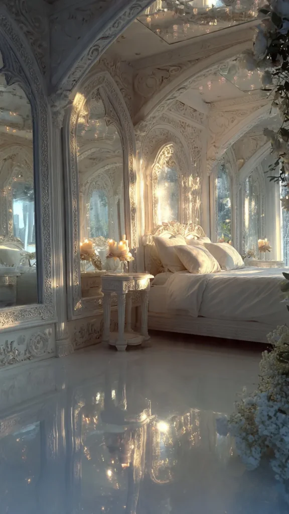 Mirrors also enhance the romantic and ethereal quality of the room.
