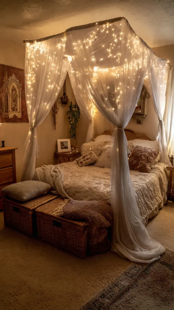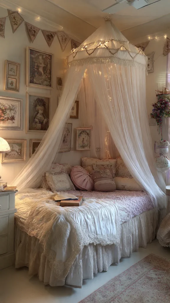 Lighting is what truly makes a fairytale bedroom feel magical. Fairy lights strung around the headboard, along the canopy frame, or around a window add a soft, star-like glow.