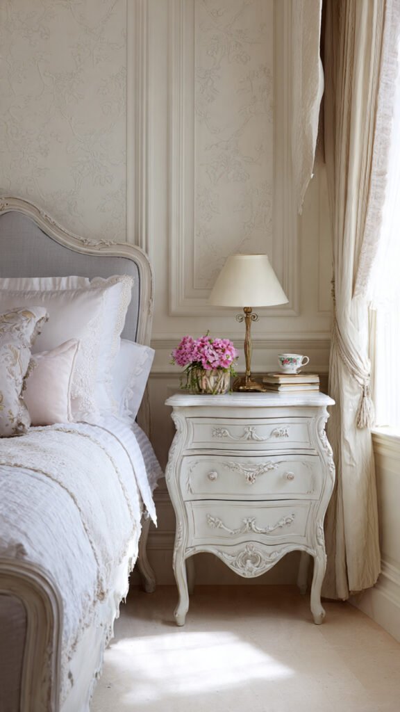 Look for dressers with ornate handles, nightstands with cabriole legs, or headboards with soft arches. Even modern furniture can work if it has rounded edges and a delicate profile.