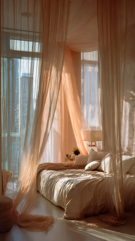 Choose fabrics like chiffon, voile, or soft tulle in whites, blush, or pale champagne tones. Let the fabric fall loosely instead of being tightly tied back so it flows gently with movement and air. This creates the illusion of sleeping inside a cloud or a storybook pavilion.