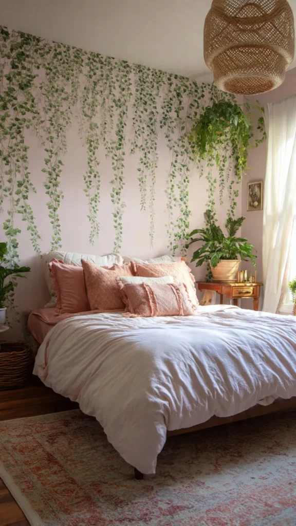 Small wildflowers, trailing vines, or watercolor-style blooms work beautifully in a fairytale bedroom. They evoke gardens, meadows, and secret outdoor spaces brought indoors.