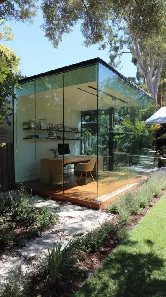 Create a contemporary workspace with floor-to-ceiling windows on three sides that flood the interior with natural light while providing inspiring garden views from every angle. Design with clean lines, minimal trim, and a flat or slightly sloped roof that emphasizes the modern aesthetic through simplified architectural forms.