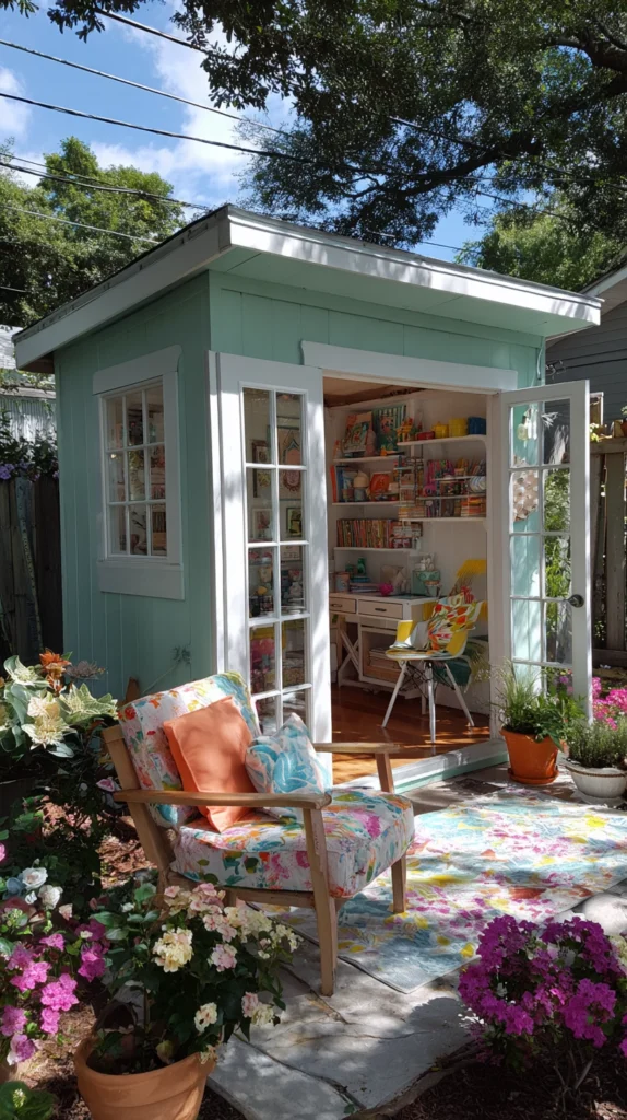 Decorate with feminine touches like floral fabrics, painted furniture in soft colors, and inspirational artwork creating a space that feels special and separate from household responsibilities. Add a comfortable seating area for breaks, reading, or visiting with friends who share creative interests.