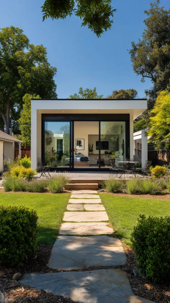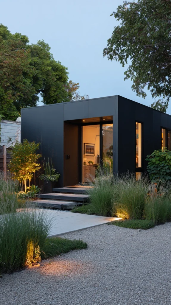 Outfit the interior with built-in desk along one wall, floating shelves for storage, and sleek modern furniture in neutral tones that maintain the streamlined sophistication. Add exterior sliding barn door or folding glass walls that open completely during pleasant weather, erasing boundaries between inside and outside.