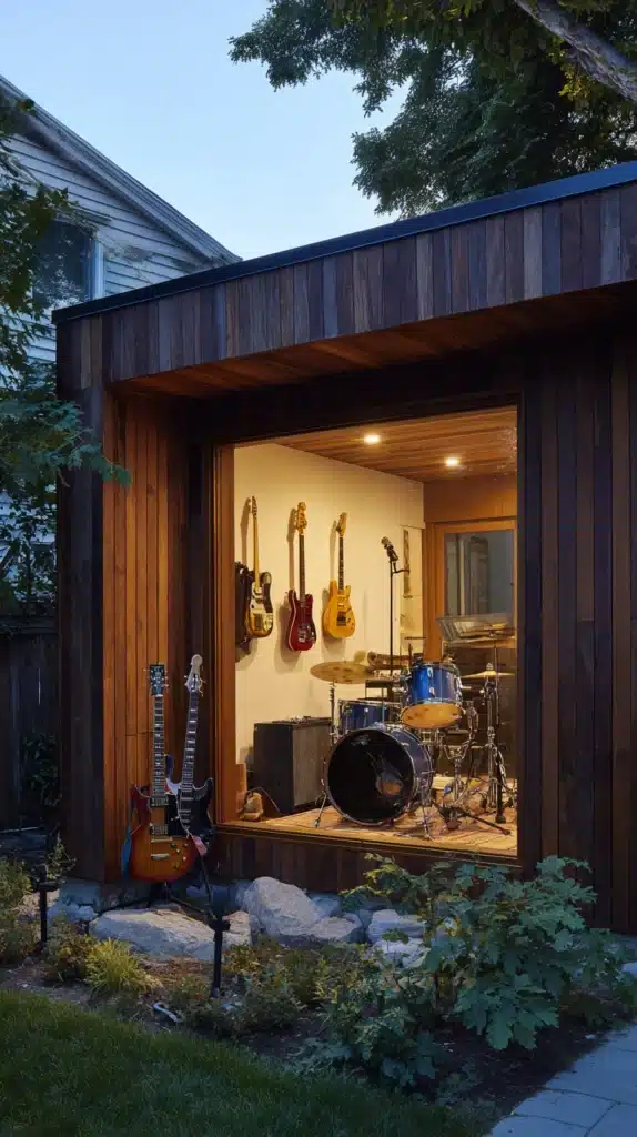 Build a soundproofed garden house specifically for music practice, recording, or teaching with acoustic treatments and sound isolation protecting household peace. Install proper electrical for amplifiers and recording equipment, acoustic panels on walls and ceiling, and specialized flooring that doesn’t transmit vibrations.