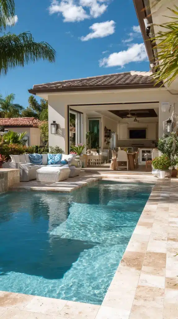 Install weather-resistant furniture, tile or concrete floors that handle moisture, and storage for pool toys, chemicals, and maintenance equipment. Add ceiling fans, proper ventilation, and perhaps air conditioning creating comfortable refuge during hot days when swimmers need breaks from sun.