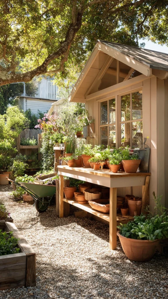 Design a functional gardening workspace with potting bench, deep sink, tool storage, and shelving for pots, seeds, and supplies creating organized headquarters for outdoor pursuits. Install windows above the work surface providing natural light and garden views while you work on transplanting, seed starting, or arrangement making.